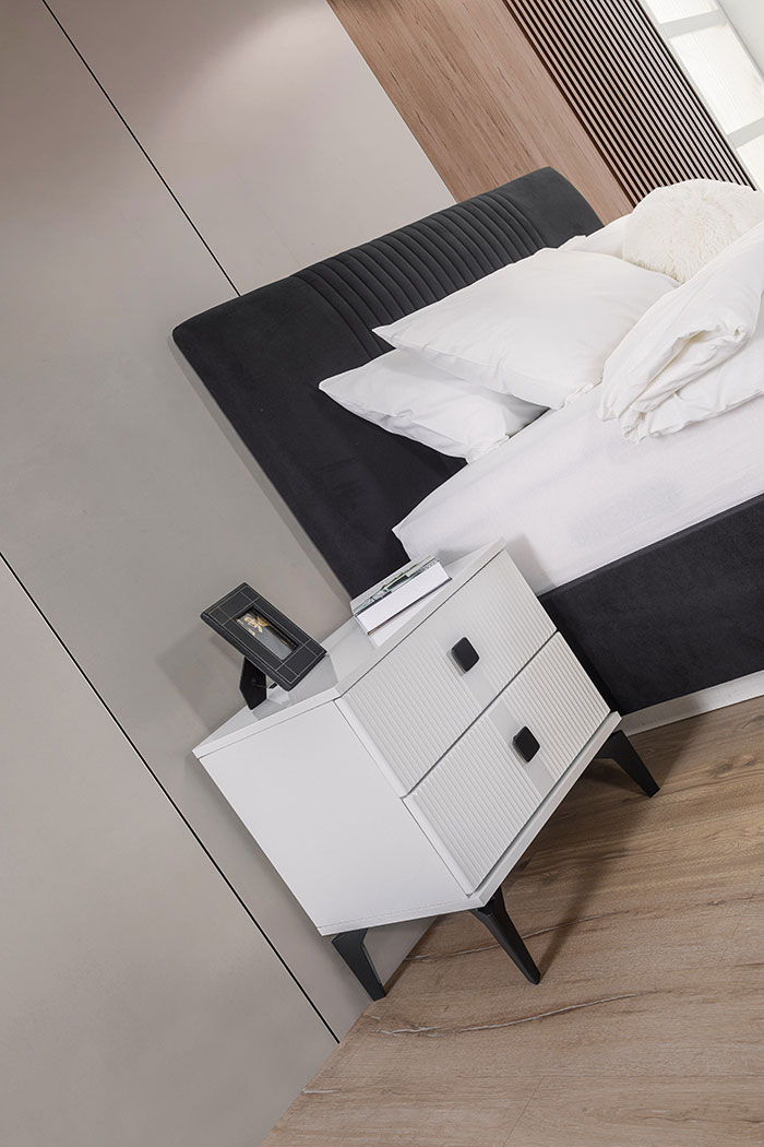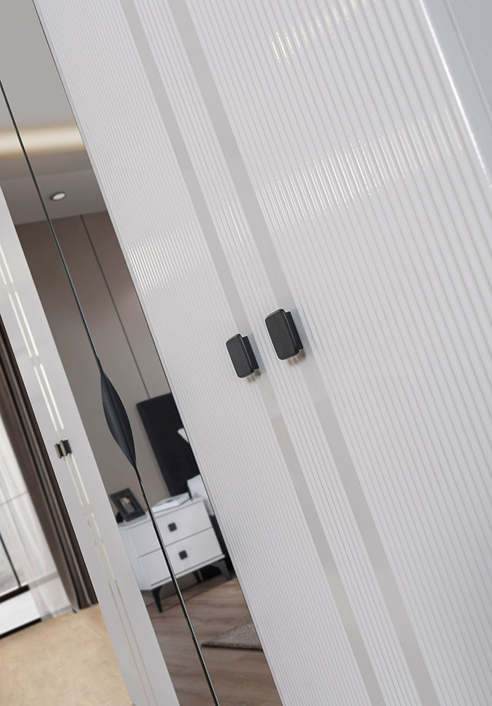 Ahşap tonlarının sıcaklığıyla harmanlanan yüzeyler, detaylardaki zarafetle bütünleşiyor. Geniş depolama alanı sunan dolaplar, konforlu karyola ve şık komodinler ile hem düzenli hem de davetkâr bir alan sunuyor.