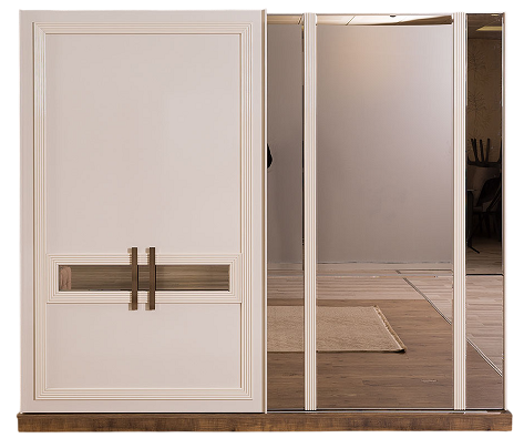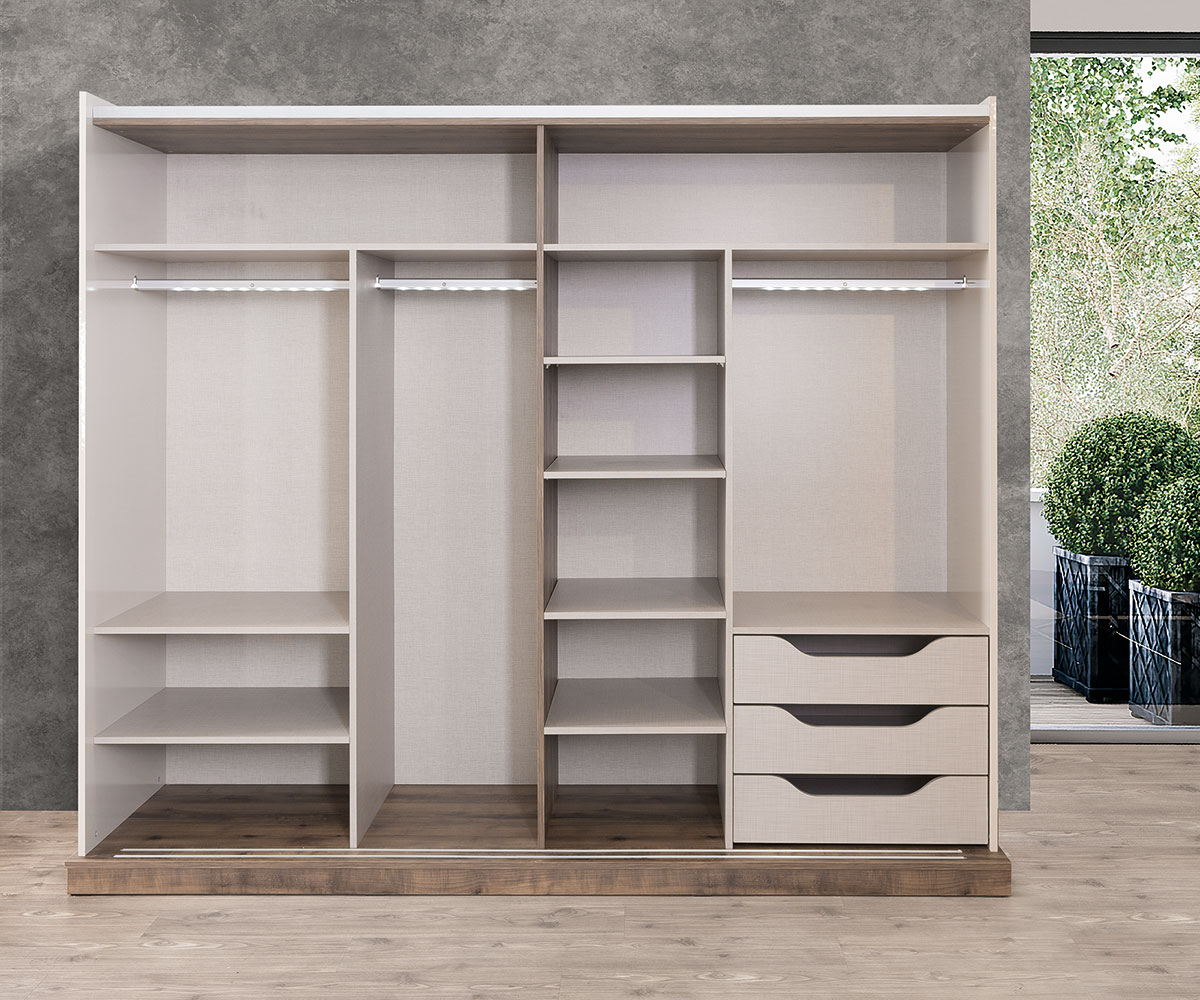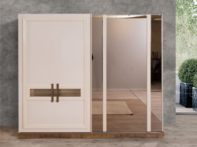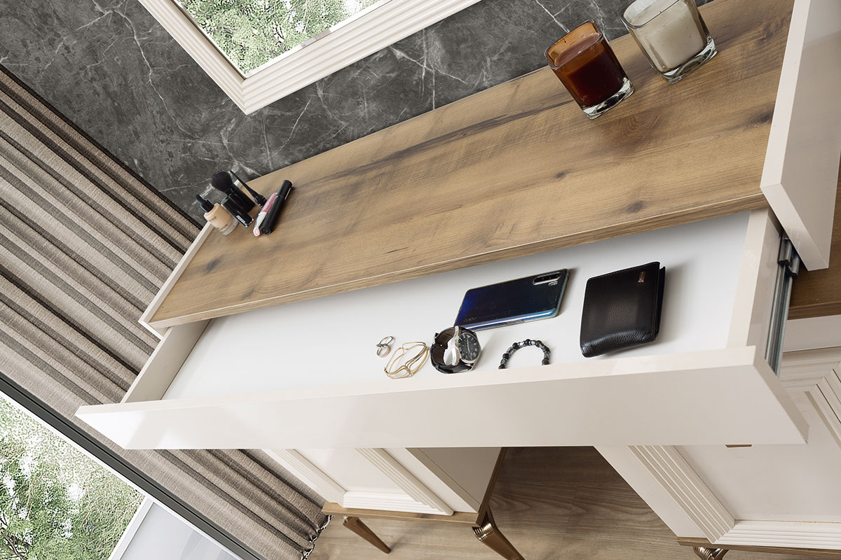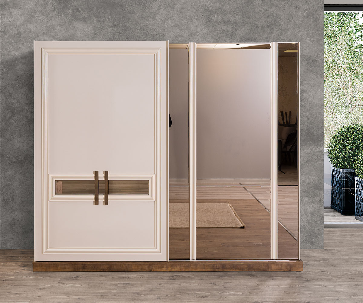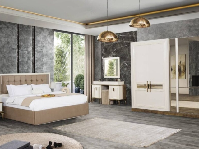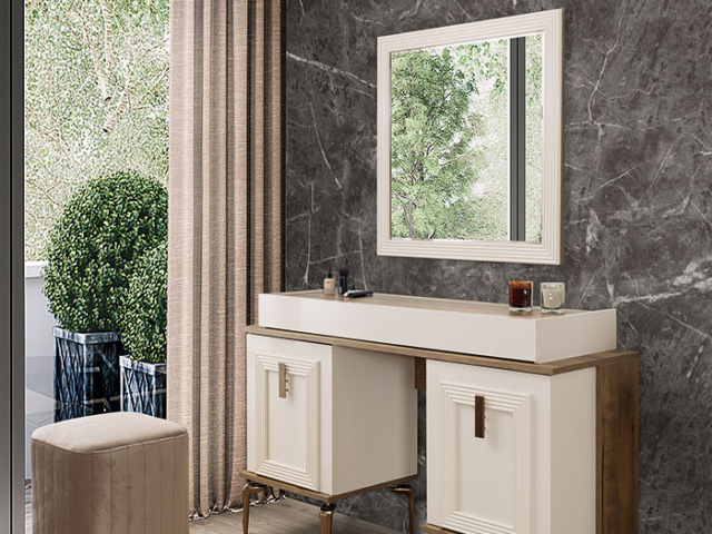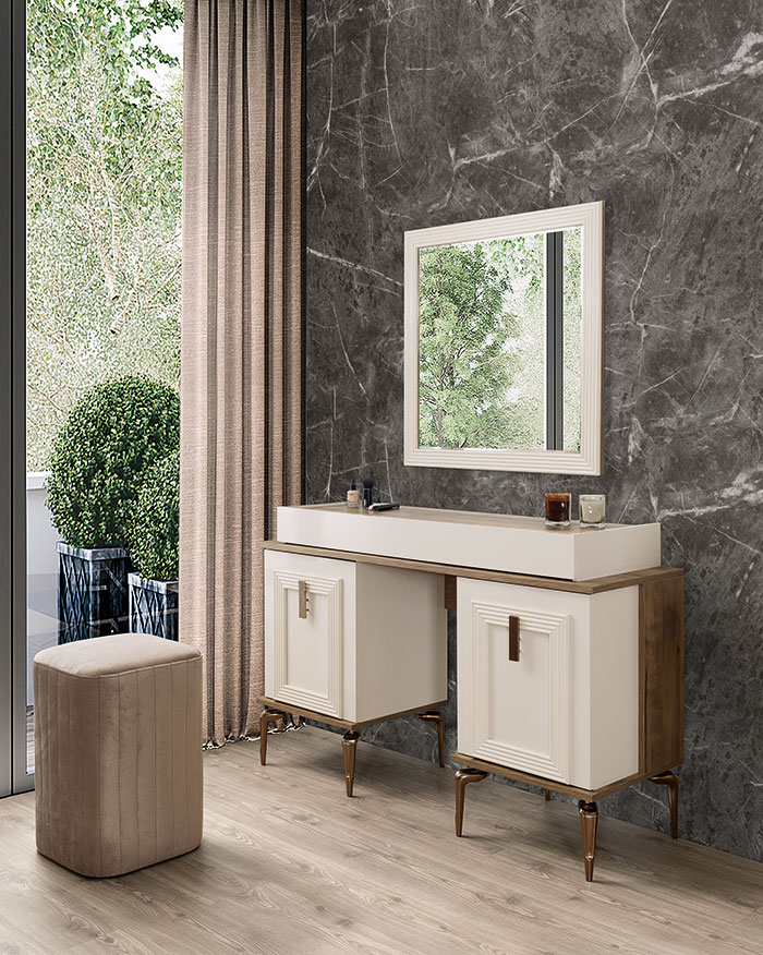 Altın detaylı kulplar ve bronz tonlarıyla çerçevelenmiş mobilyalar, sade şıklığı ihtişamlı bir dokunuşla buluşturuyor. Fonksiyonel depolama çözümleri, geniş iç hacimli gardırop ve ergonomik kullanım sunan makyaj masası ile konforu ve düzeni bir arada sunuyor.